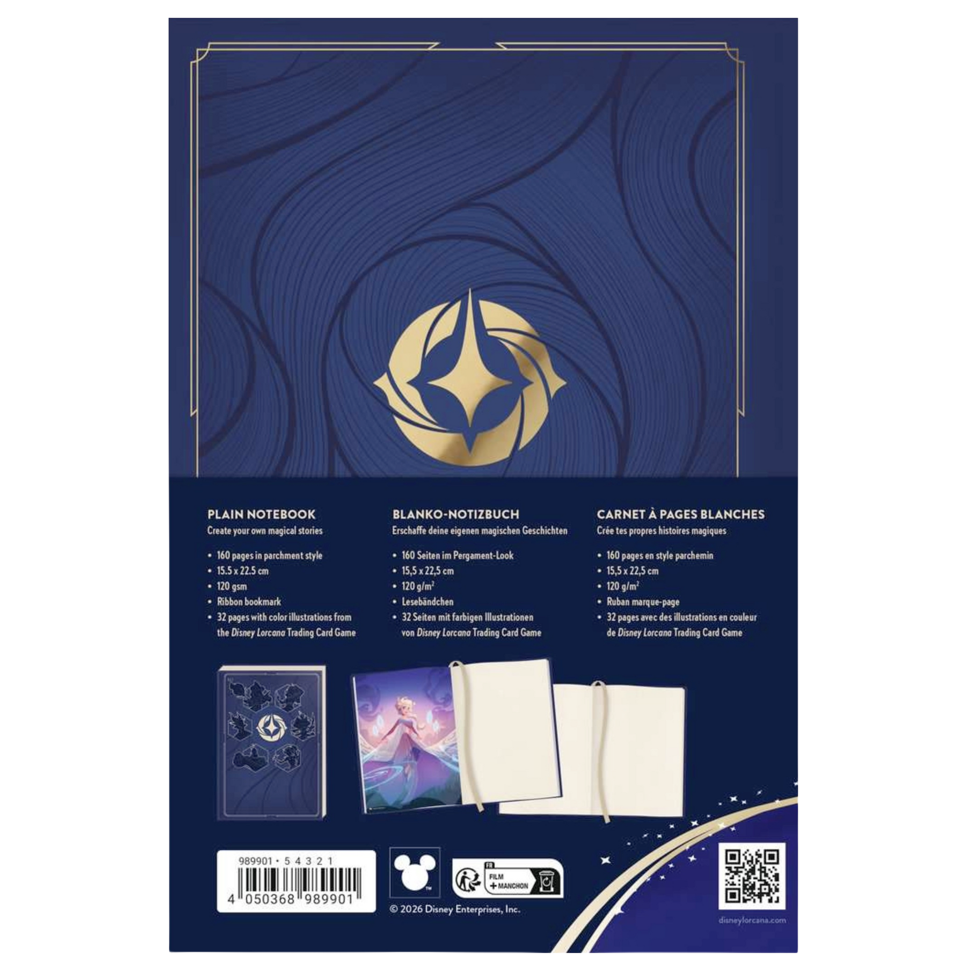 Ce carnet de notes est un produit de papeterie élégant de 160 pages, enrichi d’une trentaine d’illustrations issues de Disney Lorcana TCG.